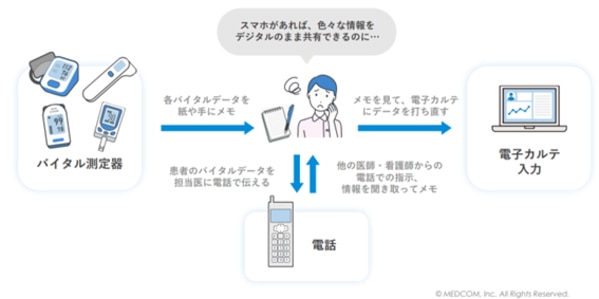 事業内容︓医療機関専用スマートフォン「メドコム」の企画・開発・販売・保守